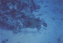 Info: Für den Taucher ist der Riesendrückerfisch der gefährlichste Fisch, der ihm überhaupt unter Wasser begegnen kann. Insbesondere wenn er in einer Sandmulde sein Gelege bewacht, ist es nicht ratsam, dicht vorbeizuschwimmen. Ausgestanzte Löcher in den Flossen und Fleischwunden an den Armen einiger Taucher zeugen von der Aggressivität des mit mächtigen Hauern versehenen Riesendrückers, der bis zu 70 cm lang wird. {Helmut Dibelius: Unterwasserführer Rotes Meer, Fische, S. 116; ISBN 3-89594-021-6}