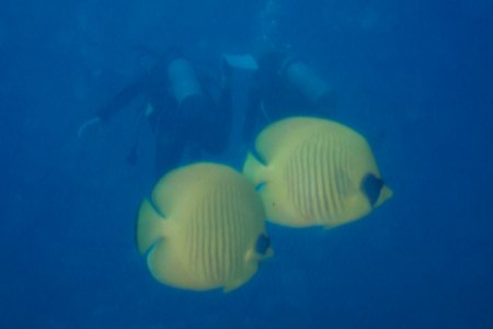 Info: Maskenfalterfische sind typische Rotmeerbewohner und fallen im sonnendurchfluteten Riff besonders auf. Falterfische sind die Freude tauchender Fotografen. Die meisten von ihnen kommen ausschliesslich im Roten Meer vor. Die tagaktiven Schwimmer ernähren sich von Korallenpolypen oder frei treibendem Zooplankton. {Helmut Dibelius: Unterwasserführer Rotes Meer, Fische, S. 138; ISBN 3-89594-021-6}