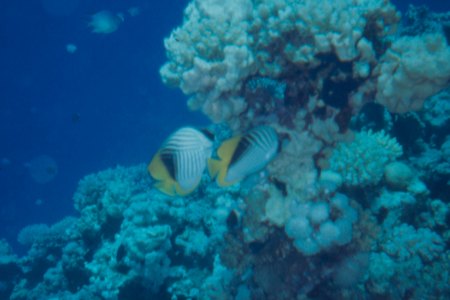 Info: Das typische Merkmal des Fähnchenfalterfisches ist das Filiament am Ende der Rückenflosse, das sonst kein Rotmeefalterfisch trägt. Er schwimmt einzeln oder parweise. Falterfische sind die Freude tauchender Fotografen. Die meisten von ihnen kommen ausschliesslich im Roten Meer vor. Die tagaktiven Schwimmer ernähren sich von Korallenpolypen oder frei treibendem Zooplankton. {Helmut Dibelius: Unterwasserführer Rotes Meer, Fische, S. 138, 144; ISBN 3-89594-021-6}