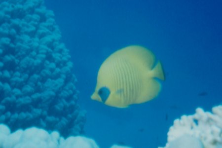 Info: Maskenfalterfische sind typische Rotmeerbewohner und fallen im sonnendurchfluteten Riff besonders auf. Falterfische sind die Freude tauchender Fotografen. Die meisten von ihnen kommen ausschliesslich im Roten Meer vor. Die tagaktiven Schwimmer ernähren sich von Korallenpolypen oder frei treibendem Zooplankton. {Helmut Dibelius: Unterwasserführer Rotes Meer, Fische, S. 138; ISBN 3-89594-021-6}