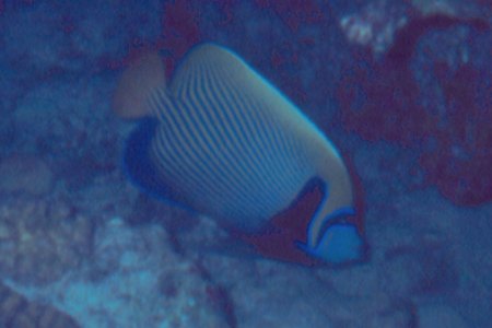 Info: Die Kaiserfische (pomacanthidae) ernähren sich von Schwämmen und Algen, aber auch von Zooplankton aus dem freien Wasser. Die größte Rotmeerart wird 50 cm lang. Die Färbungen variieren von Art zu Art ganz erheblich, insbesondere sind manchmal die Jugendformen anders gefärbt als die Alttiere. Wie unterschiedlich Jugend- und Altersform sind, zeigt unter anterem der Imperatorkaiserfisch. Er ist im Pazifik und im Roten Meer sehr häufig verbreitet. {Helmut Dibelius: Unterwasserführer Rotes Meer, Fische, S. 130; ISBN 3-89594-021-6}